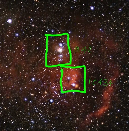 Below is a close-up of the image on the left, with M42 in the top left, and the Horsehead/Flame nebula with the star Alnitak.